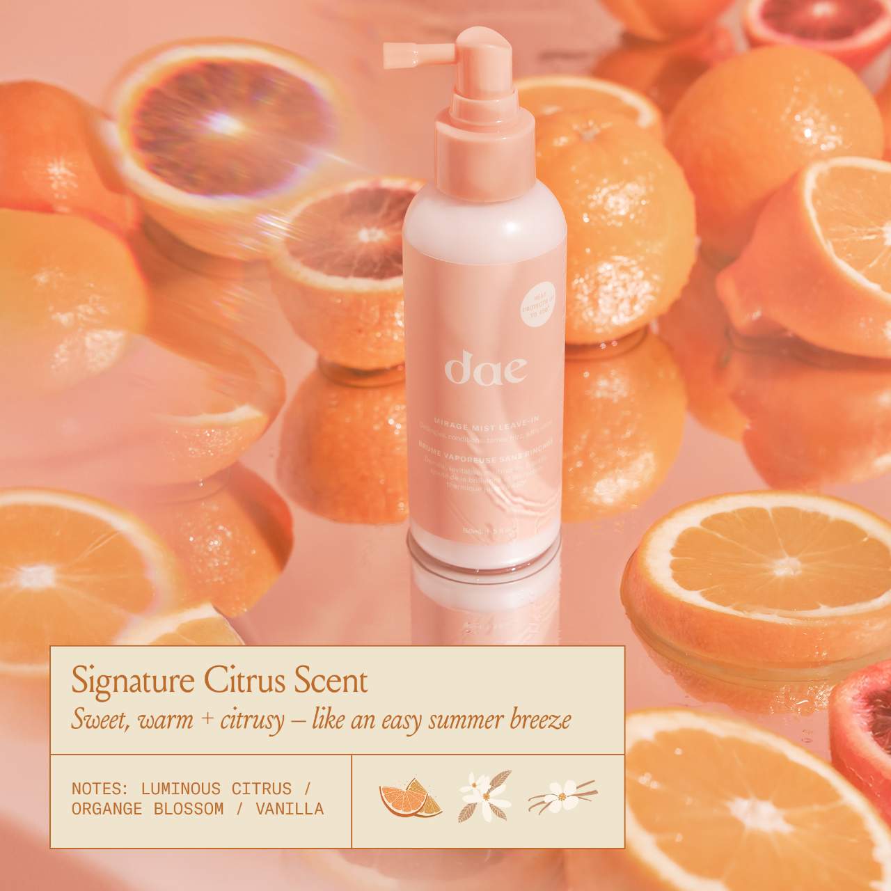 Fragrance Description: dae’s signature citrus scent is infused with sweet notes of luminous citrus, orange blossom, and vanilla. It is a warm, floral fragrance reminiscent of summer ease. Sunlit mornings spent squeezing fresh juice by hand. Afternoons running barefoot through wild, open orchards. Quiet evenings dozing as citrus trees sway with the breeze.