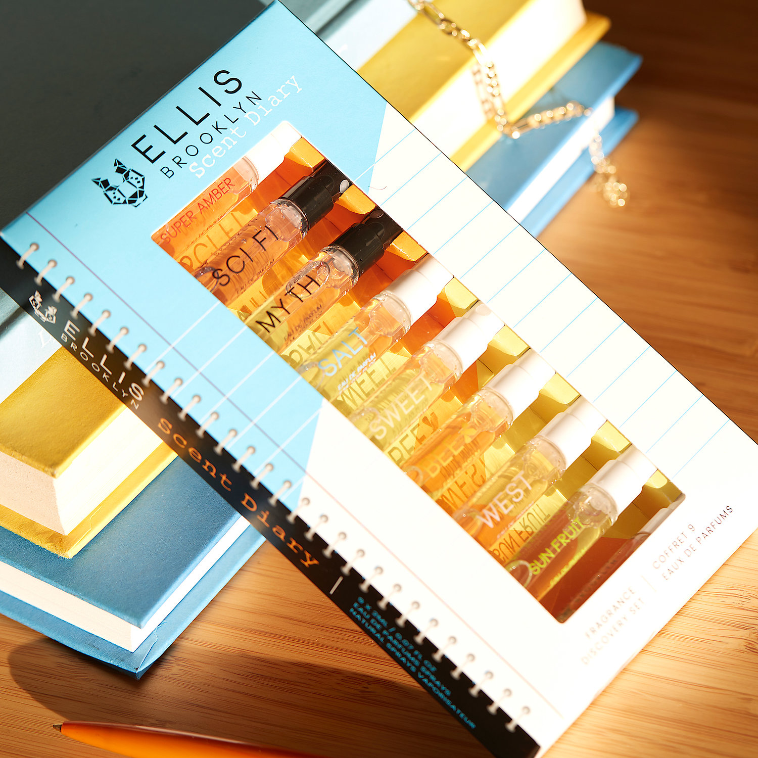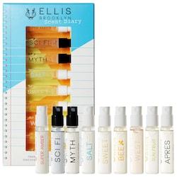 Set Description: Change up your unique perfume each day with Ellis Brooklyn’s Scent DIARY Fragrance Discovery Set. This set is a terrific intro to Ellis Brooklyn's bestsellers and newest fragrances, featuring two-milliliter glass spray vials of MYTH, SALT, SWEET, SCI FI, WEST, BEE, APRÈS, SUPER AMBER, and SUN FRUIT at an enticing value.