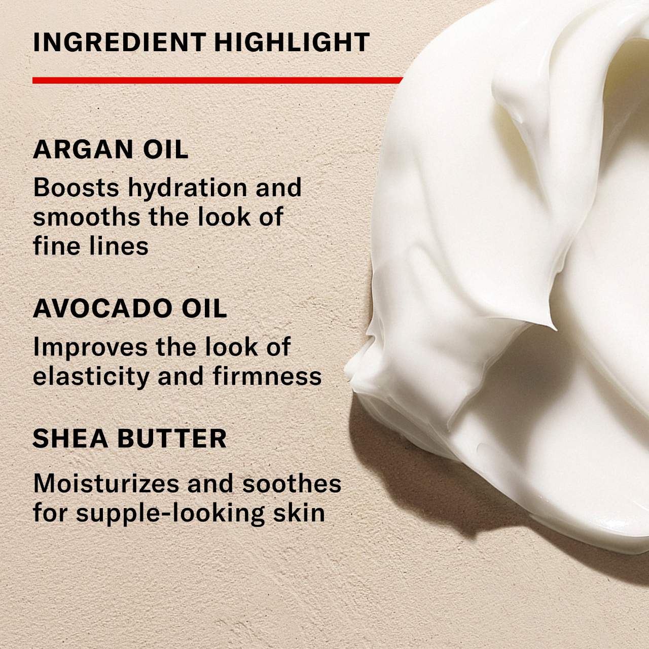 - Argan Oil: Improves hydration and visible elasticity while smoothing the look of fine lines.
