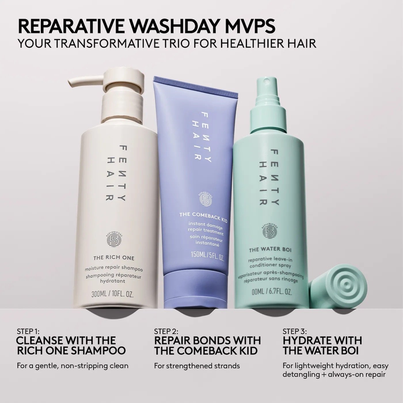 - Replenicore-5 (Fenty Hair’s Proprietary Complex): Clinically tested to repair, strengthen, hydrate, smooth, and protect.