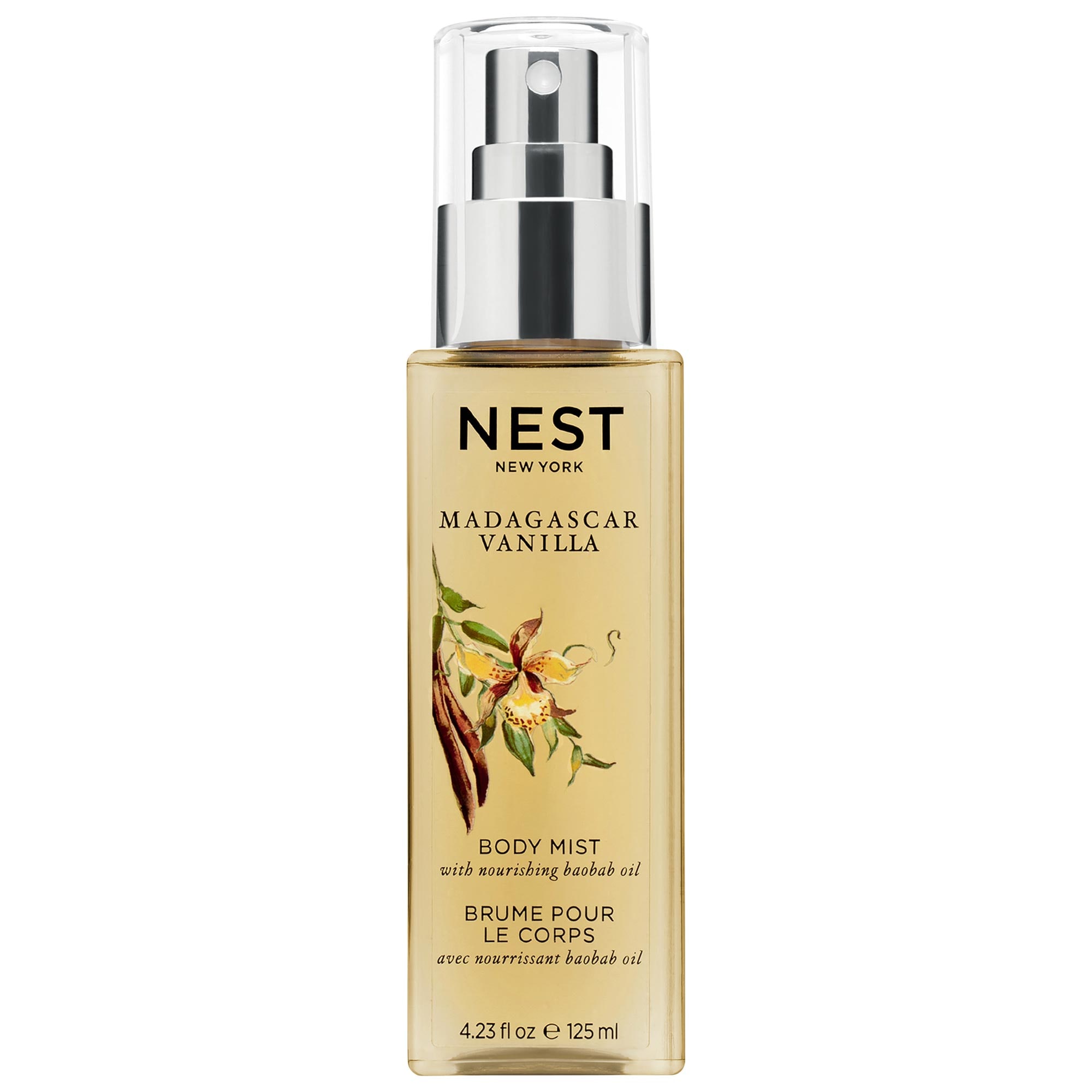 About the Fragrance: This refreshing, head-to-toe formula artfully blends a single hero note of Madagascar vanilla with baobab oil and aloe vera to nourish, soften, and scent the skin with a warm-gourmand fragrance. It can be worn alone, layered with Madagascar Vanilla Perfume Oil (sold separately) to enhance and refresh the scent throughout the day, or layered with a different NEST New York Body Mist to create a fragrance experience unique to you.