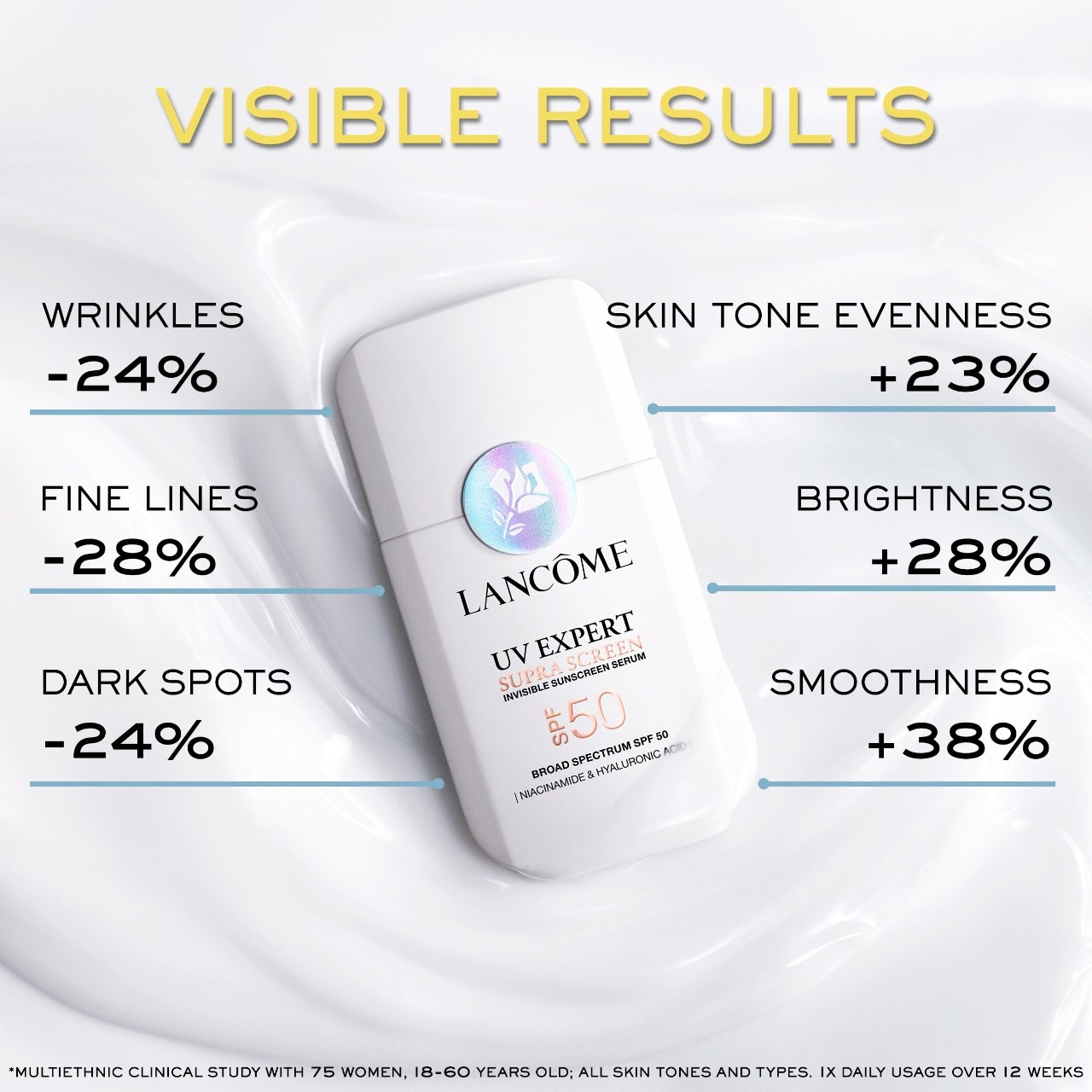Clinical Results: In a multi-phototype clinical study with 75 women of all skin tones, ages 18-65 years old, after 12 weeks of once daily usage results showed the product: