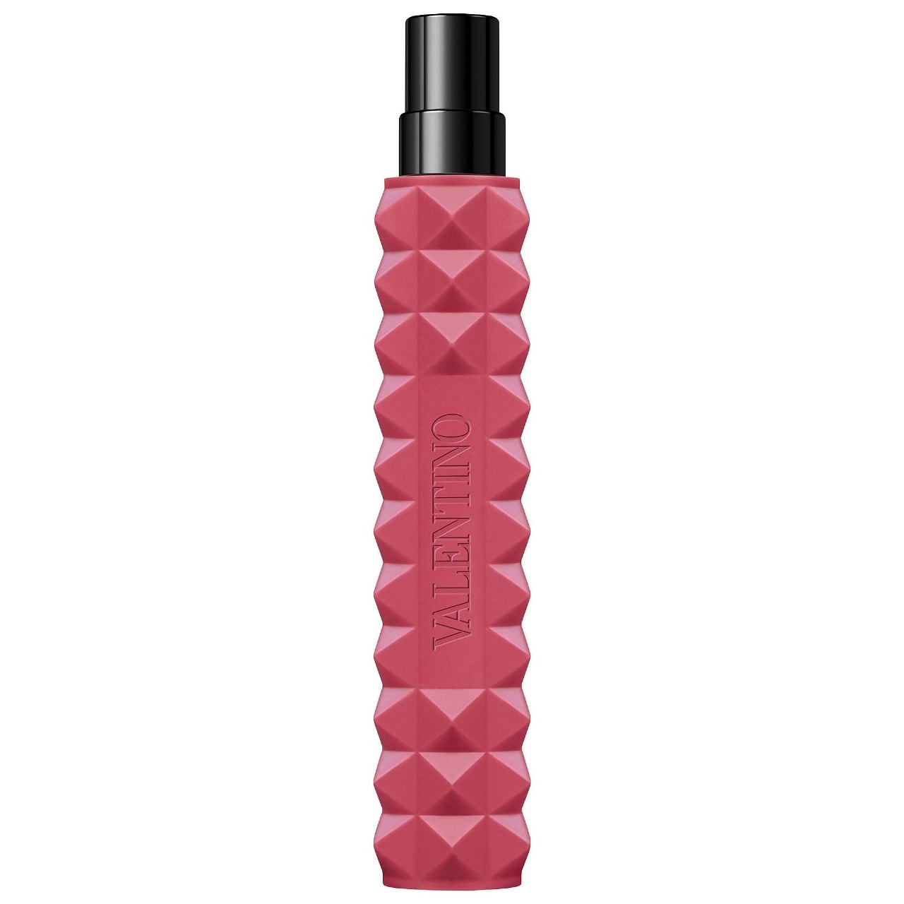 About the Bottle: Inspired by Roman architecture, the bottle’s edgy pyramidal design is a house signature of Maison Valentino. Part of Valentino’s fashion iconography and a symbol of Roma, where it embellishes the city’s doors and walls, the rock stud is a transformative symbol, taking a bag or a shoe from classic to current. The rock-studded bottle is made even more modern thanks to the contrast of black leather and vivid pink. At Valentino, pink is punk, poetic, and romantic but also bold and daring. There are no rules.