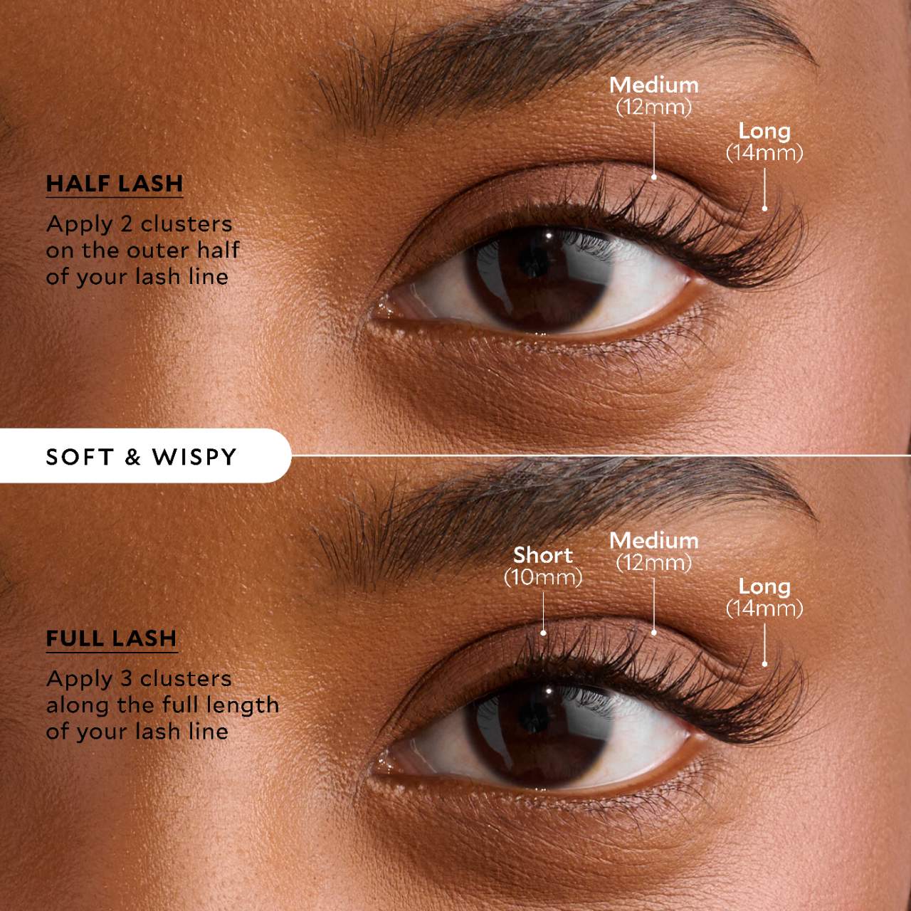 What Else You Need to Know: Handmade with lightweight and natural-looking fibers, these Self-Stick Lash Clusters are applied underneath your natural lashes for a seamless look. Use three clusters per eye for a full lash extension look or one to two clusters to create a half lash.