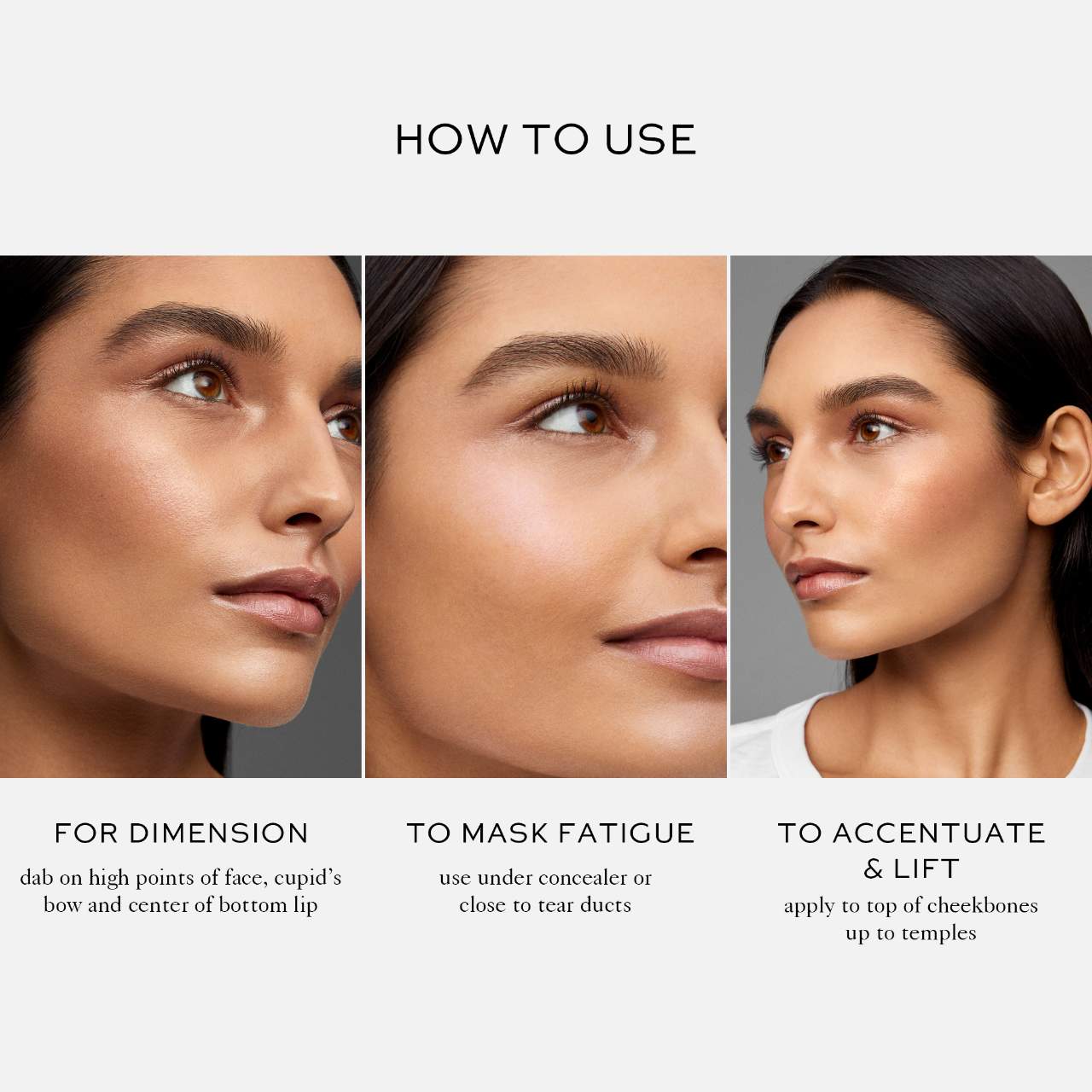 What it is: A clean, multitasking gel highlighter that delivers a facial-fresh, glow to instantly perk up dull skin. Translucent, glassy sheen.