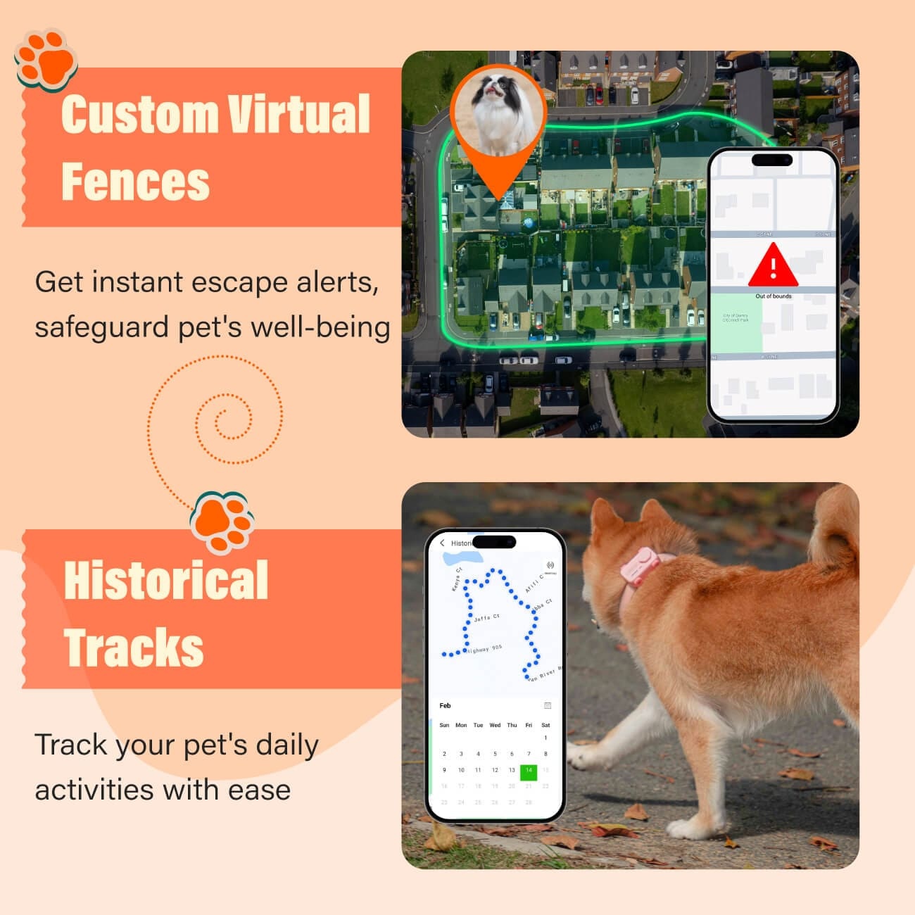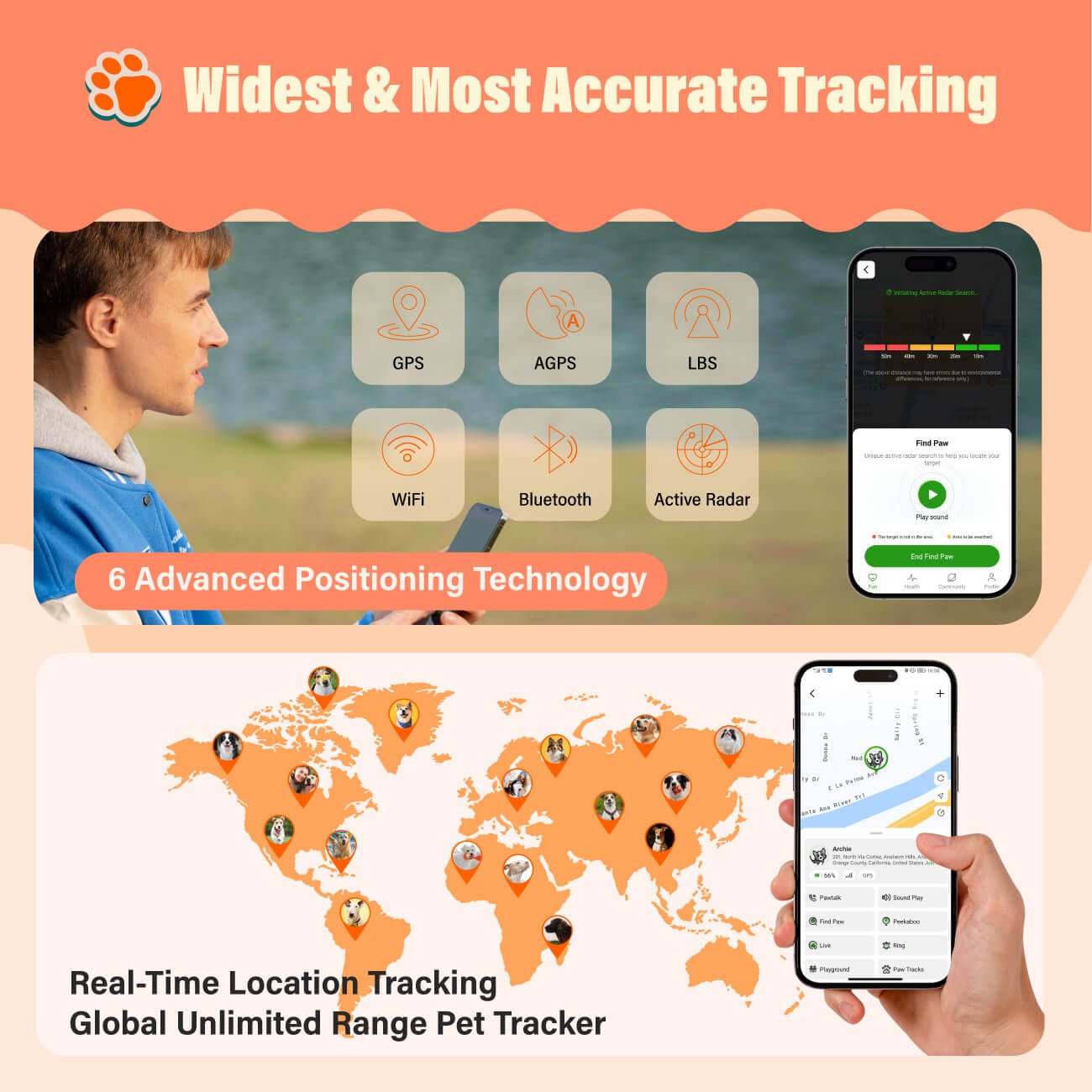 While the Geofencing sends you instant alert the moment your pet wanders off beyond the set boundaries, our PawTrack helps find your pet in real-time by using light and sound.