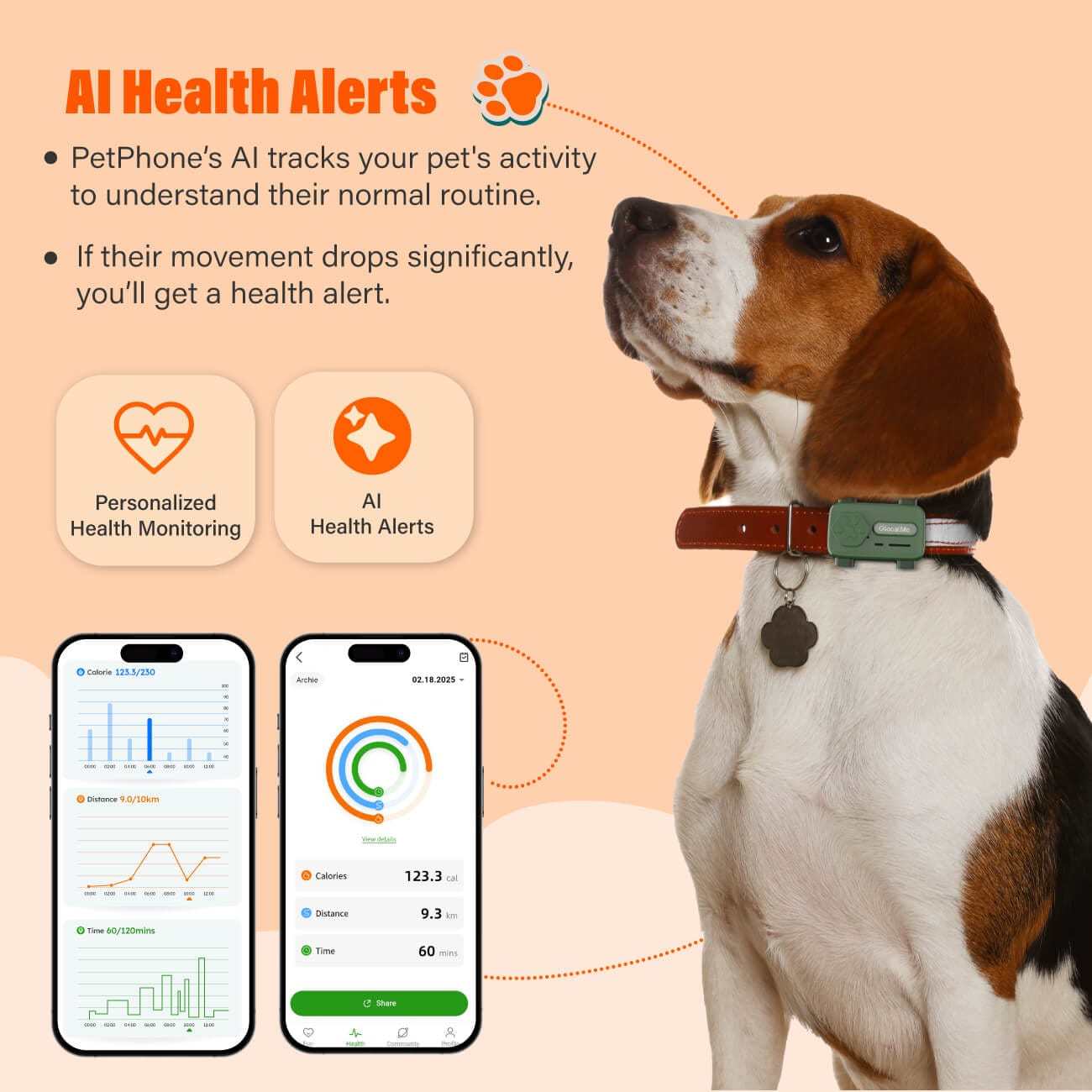 Introduce a healthy lifestyle to your pet and keep track of their exercise time, running distance, calories burned and overall activity levels in real time with constant AI updates on their well-being. The app also alerts you if your pet is out of the norm.