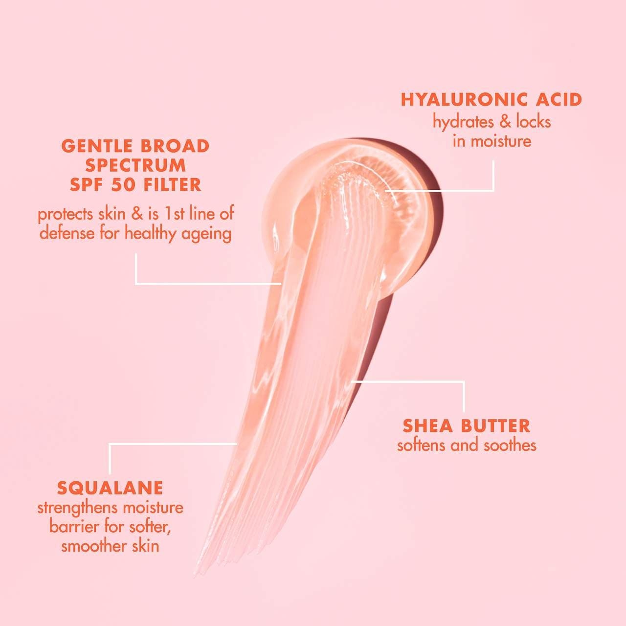 - SPF 50: Sunscreen filters that protect and act as first line of defense against aging.