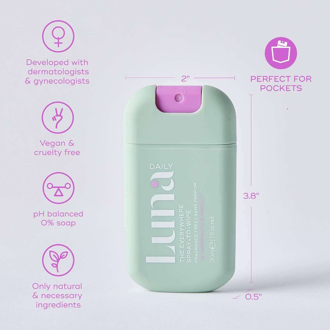 Developed with dermatologists and gynecologists and powered by Luna Daily’s unique THERMA-BIOME+™ complex of thermal water, prebiotic lactic acid, inulin, and vitamins C, E, and F to strengthen, nourish, and protect your skin microbiome. The vegan, pH-balanced formula contains zero percent soap and was tested on all skin types, including sensitive skin. It is suitable for use during pregnancy or post birth. For external use only (the vagina is self-cleaning).